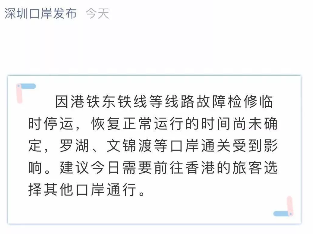 昨天上午11點(diǎn),深圳市口岸辦官方微信號(hào)“深圳口岸發(fā)布”發(fā)布消息:因港鐵東鐵線等線路故障檢修臨時(shí)停運(yùn),恢復(fù)正常運(yùn)行的時(shí)間尚未確定,羅湖、文錦渡等口岸通關(guān)受到影響。建議今日需要前往香港的旅客選擇其他口岸通行。