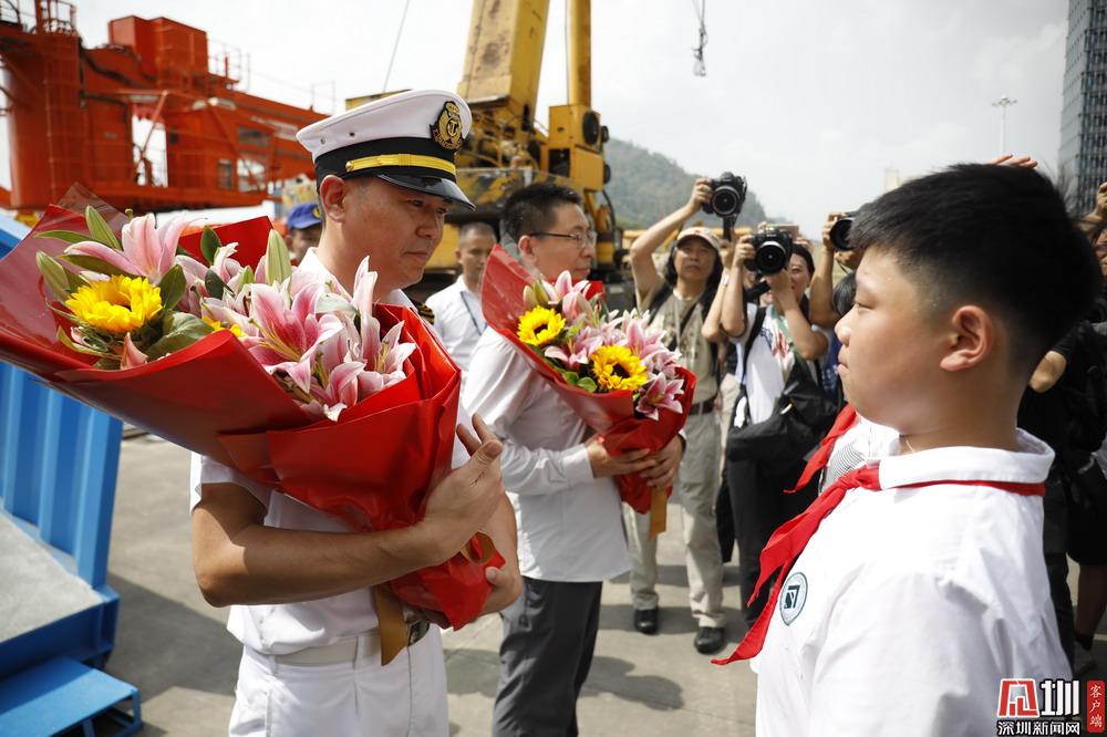 當(dāng)天下午,近百名市民、學(xué)生及各市直部門(mén)和中央駐深涉海部門(mén)代表看到“雪龍2”號(hào)船靠泊碼頭,發(fā)出熱烈的歡呼聲,他們揮舞著手中的紅旗熱烈歡迎“雪龍2”號(hào)科考船及國(guó)家第36次南極考察隊(duì)抵達(dá)深圳。當(dāng)船舶靠穩(wěn)并架設(shè)好舷梯后,深圳市政府副市長(zhǎng)、黨組成員黃敏等領(lǐng)導(dǎo)攜兩位少先隊(duì)員迎接考察隊(duì)代表,并獻(xiàn)花握手致意,表達(dá)誠(chéng)摯的歡迎和衷心的祝福。