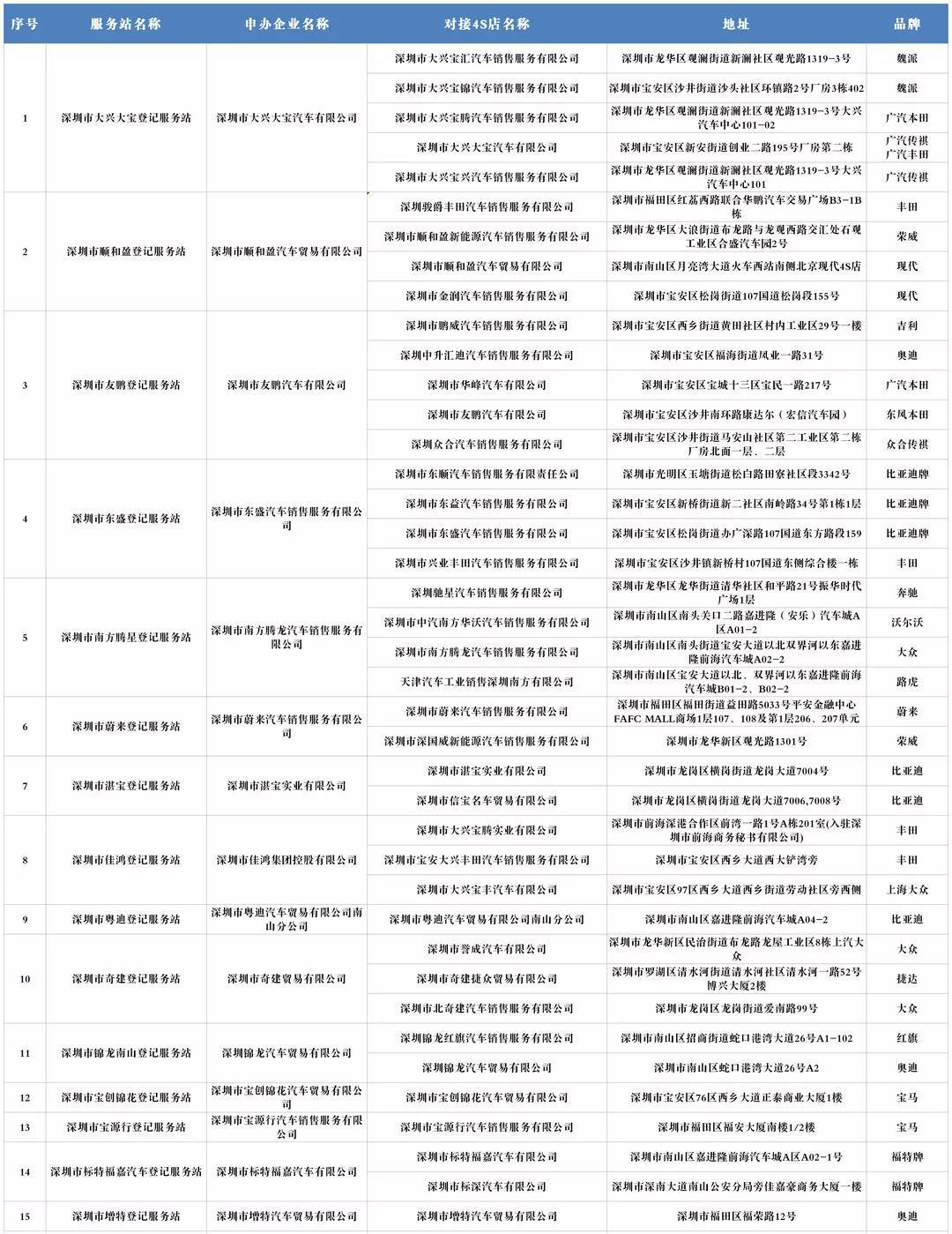據(jù)悉,2019年9月2日,深圳市交管部門選定15家新車登記服務(wù)站、5家二手車登記服務(wù)站為第一批快捷代辦登記試點,各試點可以備案多家沒有服務(wù)站的4S店(需將資料交至車管所備案)。