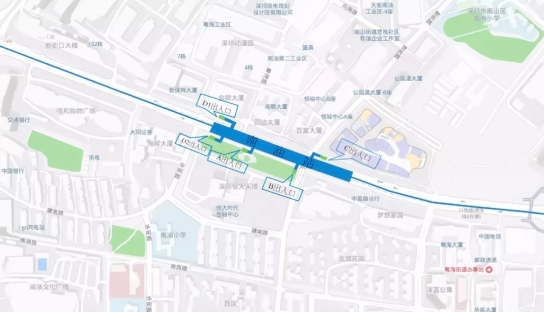 9號線二期南油站位于南山區(qū)南海大道與登良路交叉口下方,沿南海大道呈南北向敷設(shè),為地下2層車站,地下一層為站廳層,地下二層為站臺層,車站總長334m,車站出入口共計5個A出入口、B出入口、C出入口、D1出入口、D2出入口。B出入口位于恒大天璟北側(cè),C出入口位于來福士廣場一側(cè)登良路與南海大道交匯處,D1出入口位于金暉大廈東側(cè),A、D2出入口位于南海大道與華明路交匯處。