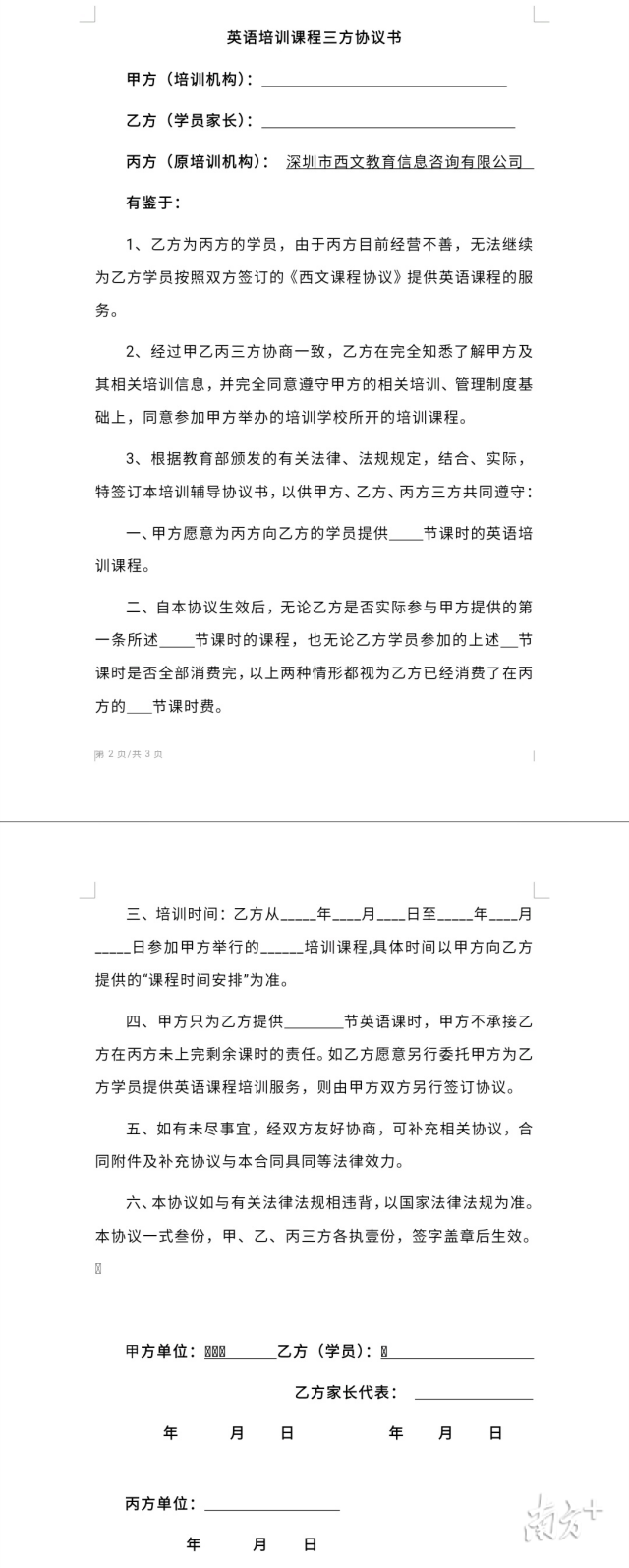 退費(fèi)群里的周女士介紹,10月20日,西文英語提供了一份“英語培訓(xùn)課程三方協(xié)議書”,但上面很多條款都沒有寫清楚。西文英語委托的律師稱,山姆大叔少兒英語愿意給西文英語的學(xué)員免費(fèi)提供30節(jié)課程,但學(xué)員在西文英語其他剩余課時(shí)的解決方案,需自行和山姆大叔協(xié)商。