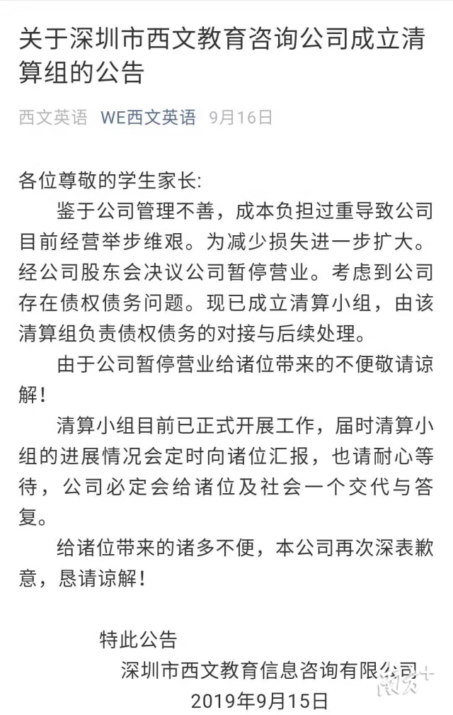 9月19日推文稱“我司全體股東將積極配合政府相關(guān)職能部門協(xié)調(diào)、解決處理學(xué)生學(xué)費(fèi)的善后事宜,近期我司將制定出妥善的處置方案?!?/p>