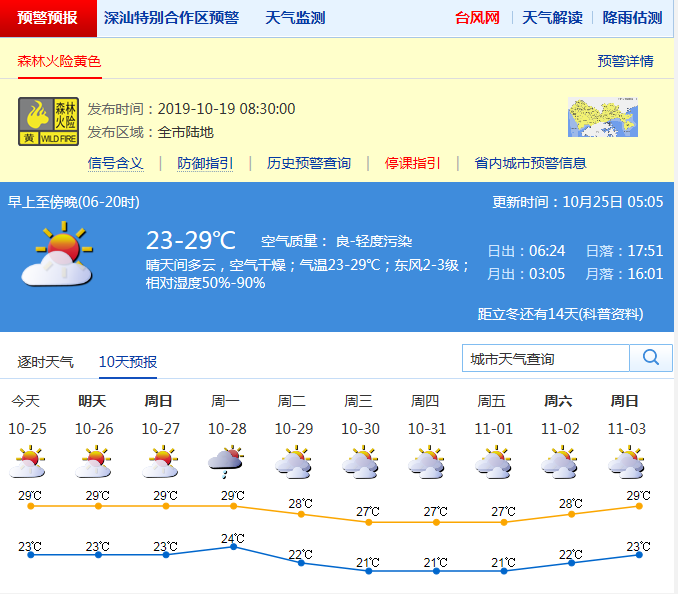 見圳客戶端·深圳新聞網(wǎng)2019年10月25日訊 深圳市氣象局預(yù)計,25-27日晴天間多云,25日氣溫23-29℃;28-29日云量增多,部分時間有分散小雨;30-31日晴天間多云。