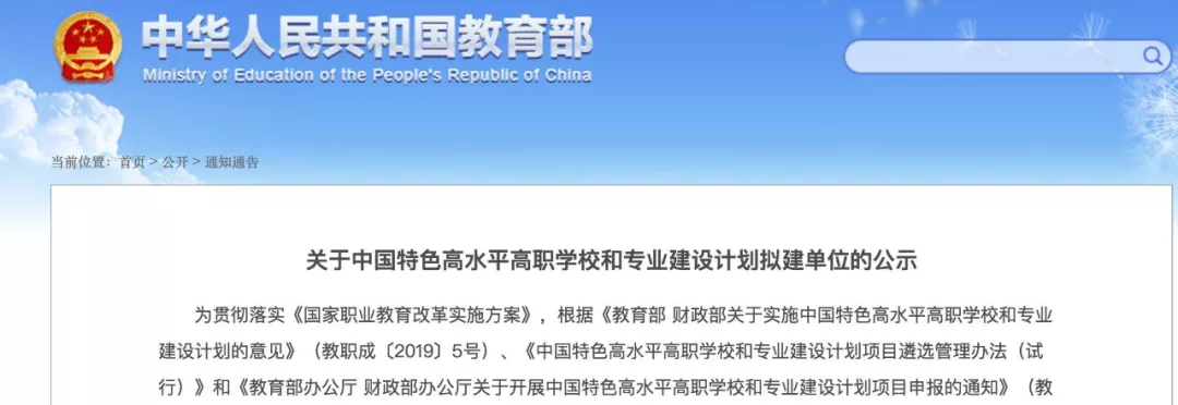 今天上午,教育部和財政部正式發(fā)布《關(guān)于中國特色高水平高職學(xué)校和專業(yè)建設(shè)計劃擬建單位的公示》,經(jīng)高職學(xué)校自愿申報,省級教育部門、財政部門審核推薦,中國特色高水平高職學(xué)校和專業(yè)建設(shè)計劃項目建設(shè)咨詢專家委員會評審,教育部、財政部審定,擬立項中國特色高水平高職學(xué)校和專業(yè)建設(shè)計劃建設(shè)單位197個(簡稱“雙高計劃”),現(xiàn)予公示。公示期7天(2019年10月25日—10月31日)。