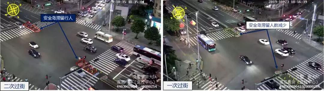 為更好地保障行人過街安全,將蓮花/景田/景田東路口高峰期南北行行人的2次過街方案改為1次過街。調(diào)整后,路口延誤分別為50.1秒、54.9秒,上升了9.6%;中間過街島滯留人數(shù)分別是1300人/小時(shí)和242人/小時(shí),下降了81.4%;行人平均等待過街時(shí)間分別是70秒和111秒,上升58.6%;東西方向車輛平均排隊(duì)長度由36米增至102米。