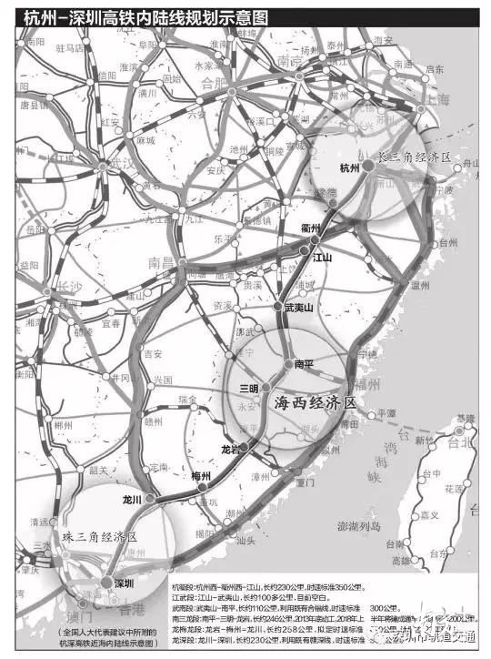 去年,參加全國兩會的部分全國人大代表提出一份《關(guān)于將杭深高鐵近海內(nèi)陸線列入國家“十三五”現(xiàn)代綜合交通發(fā)展規(guī)劃修編和國家中長期鐵路網(wǎng)規(guī)劃的建議》。杭深高鐵近海內(nèi)陸線擬自杭州西經(jīng)衢州西-江山-武夷山-南平-三明-龍巖-梅州-龍川至深圳,總長約1200公里。
