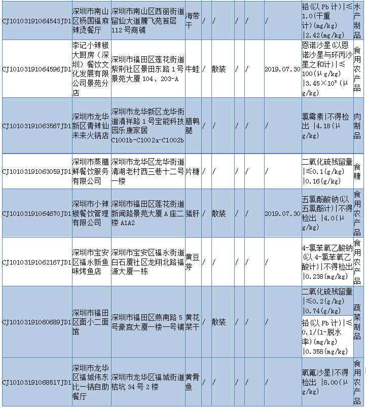 見(jiàn)圳客戶(hù)端 ·深圳新聞網(wǎng)2019年11月6日訊 11月5日,深圳市市場(chǎng)監(jiān)督管理局發(fā)布2019年第四十期食品安全抽樣檢驗(yàn)情況通報(bào),通報(bào)稱(chēng),深圳市市場(chǎng)監(jiān)督管理局于2019年8-9月組織對(duì)我市餐飲環(huán)節(jié)的食品開(kāi)展了抽樣檢驗(yàn)工作,本次共抽檢餐飲環(huán)節(jié)食品671批次,涉及餐飲環(huán)節(jié)經(jīng)營(yíng)主體584家次,共檢測(cè)食品指標(biāo)3385項(xiàng)次。其中檢出不合格樣品12批次,涉及不合格食品類(lèi)別有酒類(lèi)2批次均為米酒;肉制品2批次為臘肉和臘鴨腿;食糖1批次、食用農(nóng)產(chǎn)品5批次牛蛙、豬肝等在列;蔬菜制品1批次、水產(chǎn)制品1批次。
