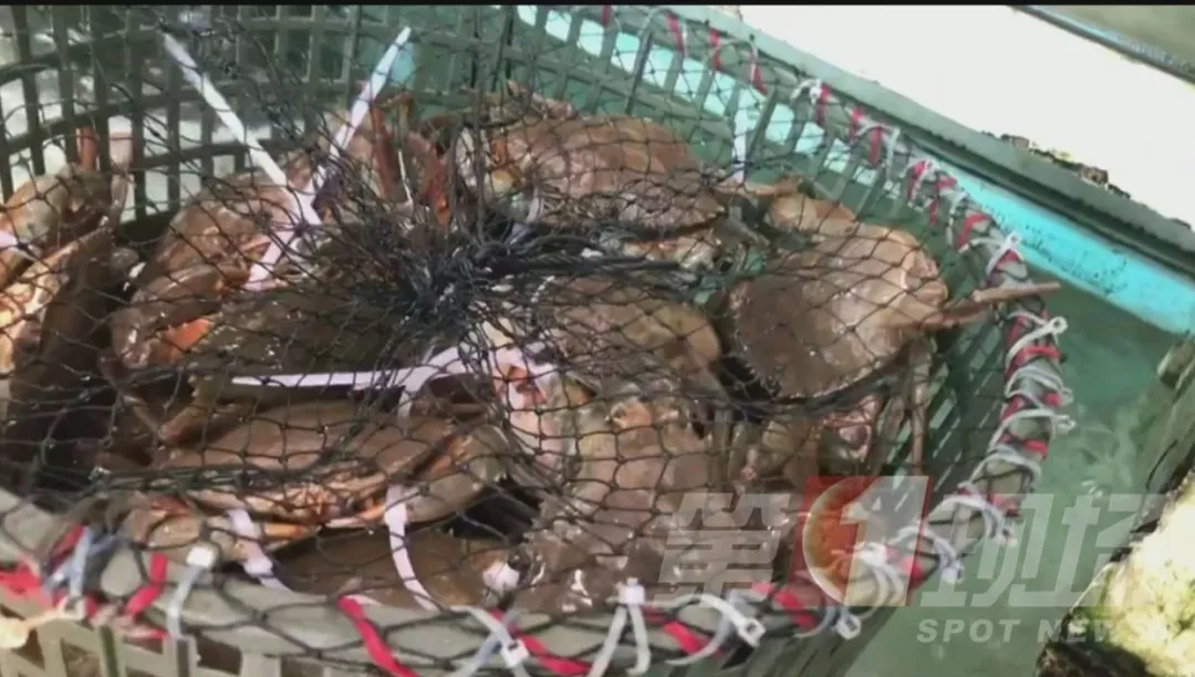 ▲羅芳水產(chǎn)批發(fā)市場內(nèi),膏蟹用白色塑料繩來捆綁。