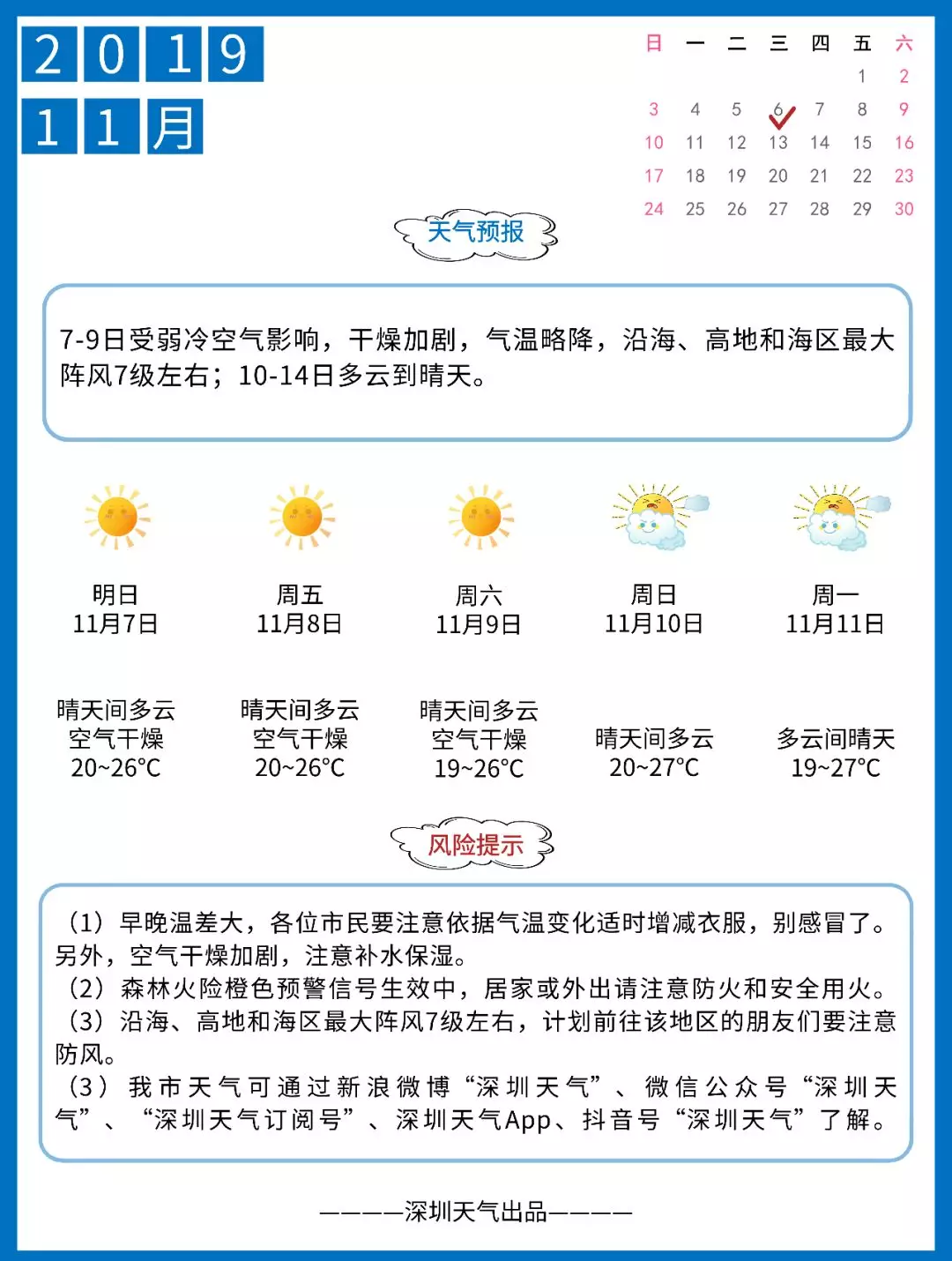 預(yù)計(jì)11月天氣較平穩(wěn),降水偏少,空氣干燥,早晚溫差較大。由于大氣擴(kuò)散氣象條件較差,部分地區(qū)可能會出現(xiàn)灰霾天氣。雖然目前深圳的冷空氣,好像都不太給力,但是降溫這事誰說得準(zhǔn)呢,所以,要注意增添衣物啊~