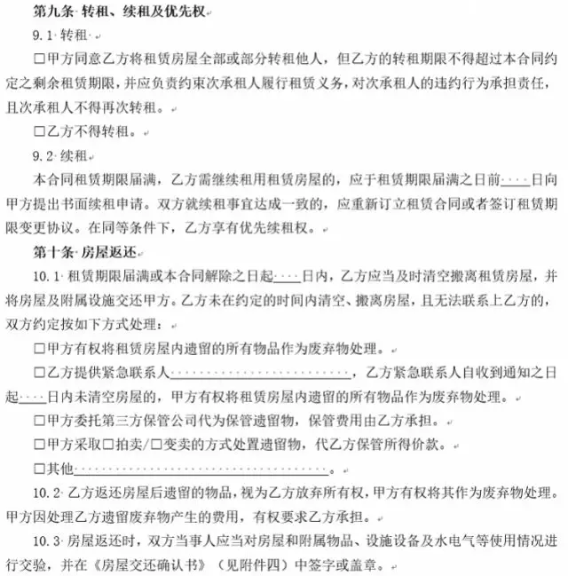 4、增設承租人下落不明時,出租人對租賃房屋內的遺留物處理條款。實踐中,存在很多承租人無力支付租金時斷絕與出租人聯(lián)系的情形。為解決出租人無法聯(lián)系承租人時對租賃房屋內遺留物的處理問題,新版合同增設承租人未按約定交還房屋且下落不明時遺留物的處理條款,由雙方當事人在簽訂合同時就此問題協(xié)商一致,避免出租人遭受無法收回房屋導致房屋使用價值無法實現(xiàn)的損失或者因自行處置遺留物引起糾紛、面臨侵權責任的風險,有效解決承租人下落不明時租賃房屋內遺留物的處理問題。