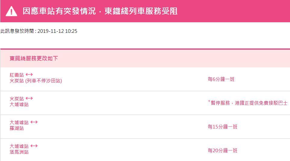 據(jù)港鐵官網(wǎng)目前最新消息,東鐵線列車運營服務(wù)調(diào)整為:紅磡站至火炭站每6分鐘一班;火炭站至大埔墟站暫停服務(wù);大埔墟站至羅湖站每15分鐘一班;大埔墟站至落馬洲站每20分種一班。港鐵其他線路也有多處調(diào)整。