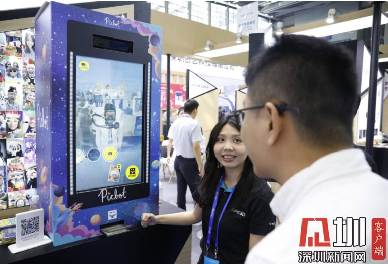 2019年11月13日,深圳會展中心,一位正在與機器互動的觀眾。該機器是由臺灣公司啟云科技設(shè)計,多用在營銷領(lǐng)域,用戶可與之互動拍出照片。