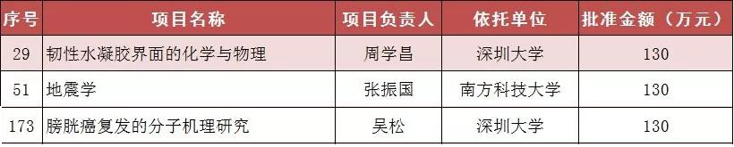 深圳大學(xué)2個(gè),分別是:韌性水凝膠界面的化學(xué)與物理(項(xiàng)目負(fù)責(zé)人:周學(xué)昌);膀胱癌復(fù)發(fā)的分子機(jī)理研究(項(xiàng)目負(fù)責(zé)人:吳松);