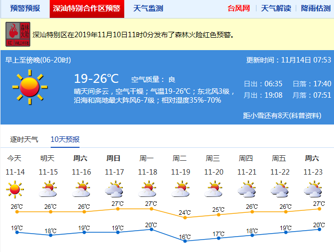 深圳市氣象臺預計,13日夜間至14日受冷空氣影響,我市沿海、高地和海區(qū)最大陣風7級左右,氣溫略降,19-26℃;15-17日晴天,風力減弱;18-19日受新一股冷空氣影響,北風再次加大,氣溫下降。