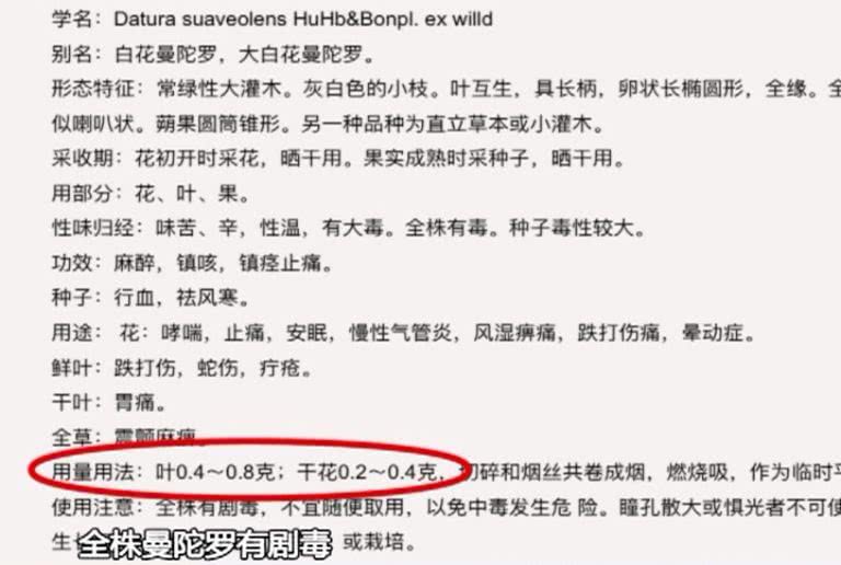 據(jù)了解,曼陀羅又名洋金花,有一定的藥用價值,但也有毒理作用,有多例報道介紹過曼陀羅致人中毒事件。據(jù)相關資料顯示,曼陀羅葉應用藥0.4克至0.8克,干花用藥0.2克至0.4克,使用注意事項提及到,全株曼陀羅有劇毒,不宜隨便取用,以免中毒發(fā)生危險。
