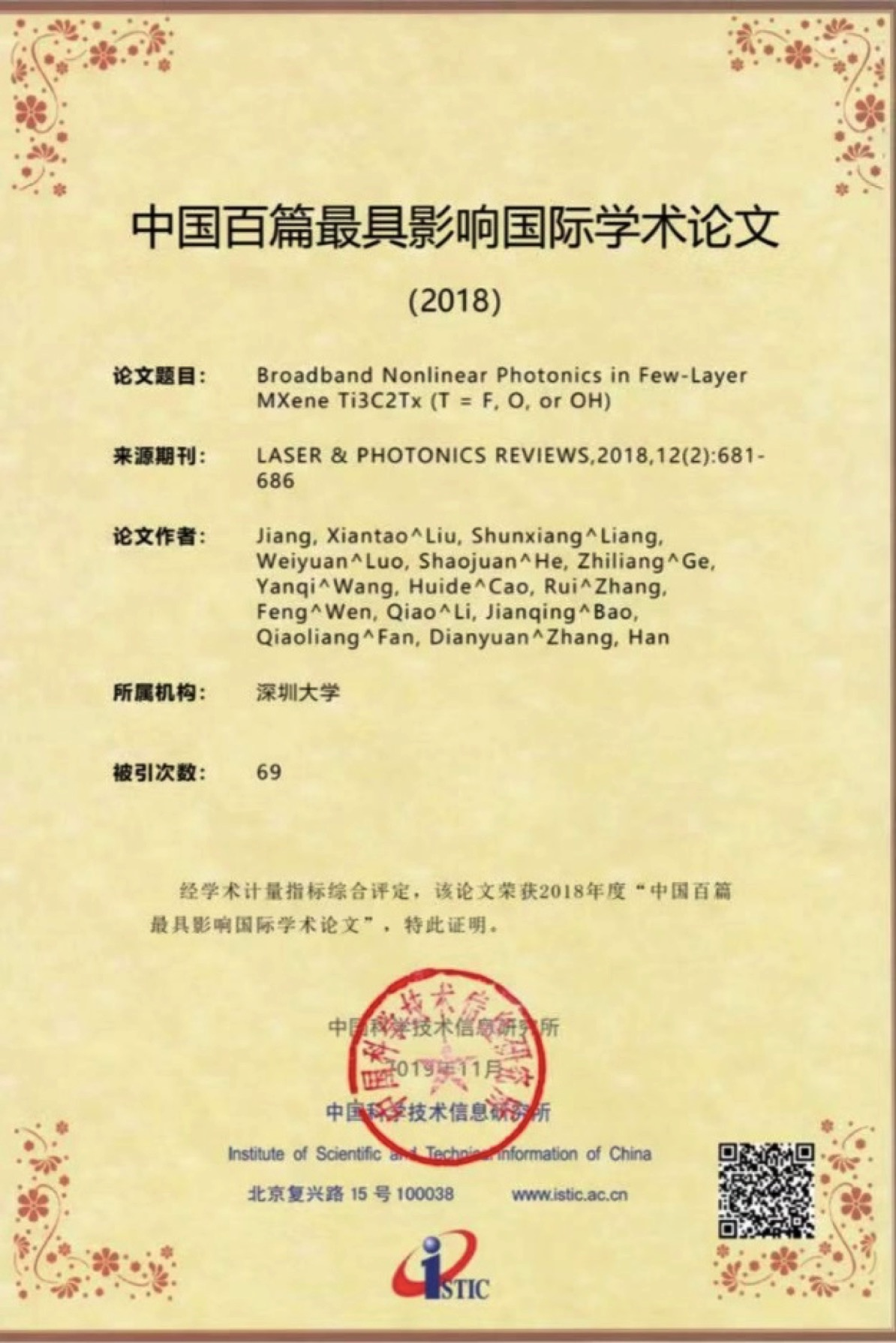 深圳特區(qū)報2019年11月22日訊 11月19日,中國科學技術(shù)信息研究所在北京召開中國科技論文統(tǒng)計結(jié)果發(fā)布會,公布了2018年中國百篇最具影響國際學術(shù)論文。深圳大學張晗教授課題組2篇論文入選,深大入選數(shù)量在中國內(nèi)地高校和研究機構(gòu)中并列第10。