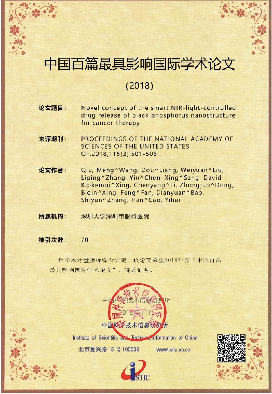 原標題:2018年中國百篇最具影響國際學術(shù)論文公布,深大張晗課題組2篇論文入選