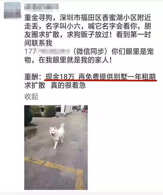 近日,深圳有位狗主人在朋友圈尋狗,重酬的內(nèi)容是:現(xiàn)金18萬(wàn)+一年別墅使用權(quán)