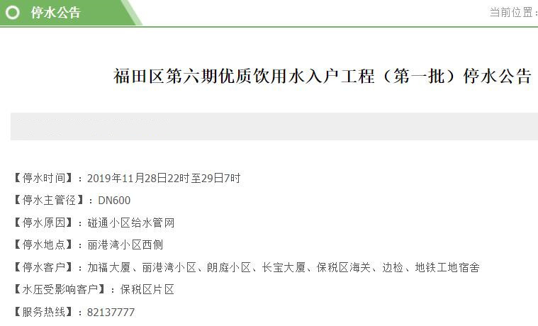 停水客戶:加福大廈、麗港灣小區(qū)、朗庭小區(qū)、長寶大廈、保稅區(qū)海關(guān)、邊檢、地鐵工地宿舍