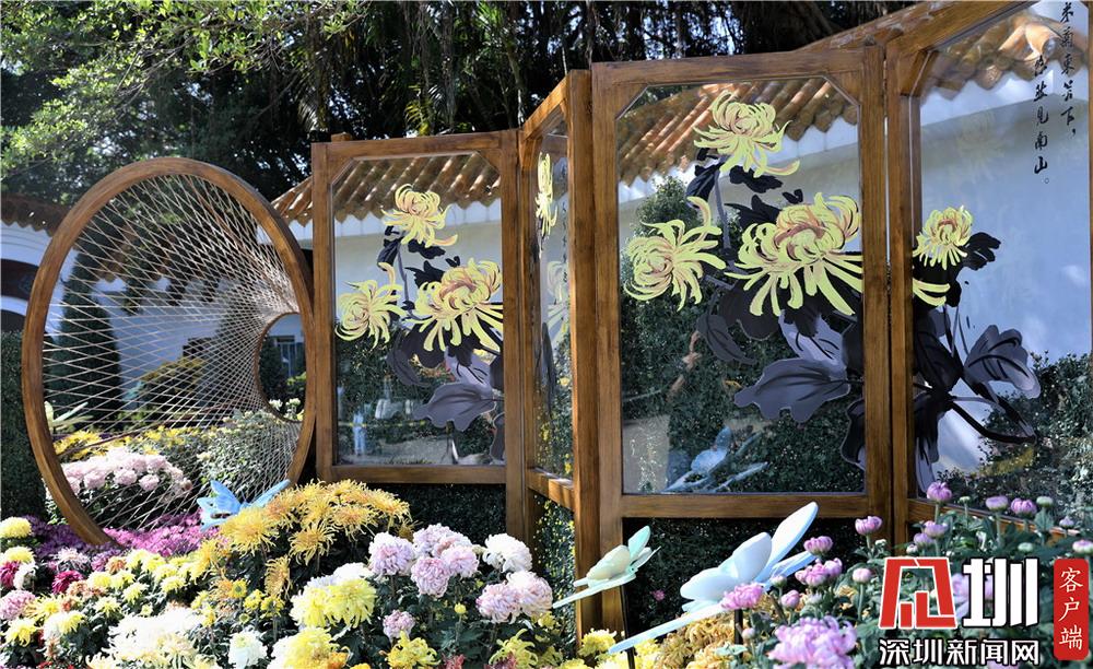 相較往年,今年的品種菊和盆景菊還增添了背景裝飾,結合展示菊花詩詞、山水圖案的竹簾畫和布畫裝飾,突顯菊花的文化魅力,豐富菊花展的文化內(nèi)涵。