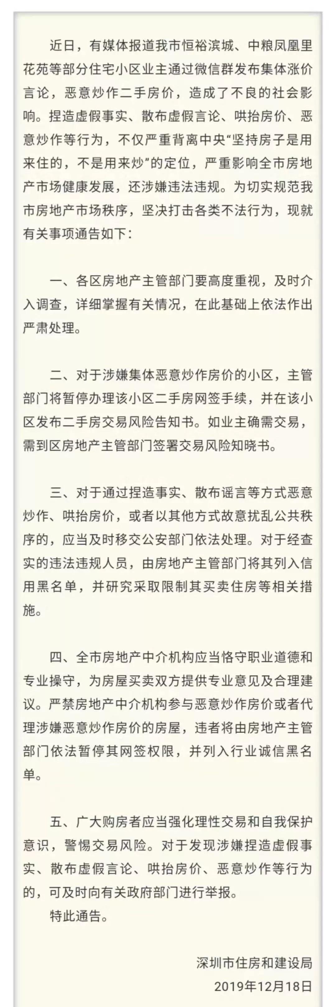 12月18號(hào)深圳市住建局發(fā)布通稿稱嚴(yán)厲打擊哄抬房?jī)r(jià)等違規(guī)行為
