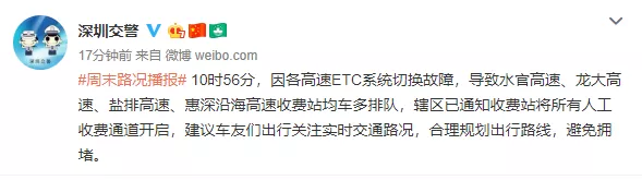 10時(shí)56分,因各高速ETC系統(tǒng)切換故障,導(dǎo)致水官高速、龍大高速、鹽排高速、惠深沿海高速收費(fèi)站均車多排隊(duì),轄區(qū)已通知收費(fèi)站將所有人工收費(fèi)通道開啟,建議車友們出行關(guān)注實(shí)時(shí)交通路況,合理規(guī)劃出行路線,避免擁堵。