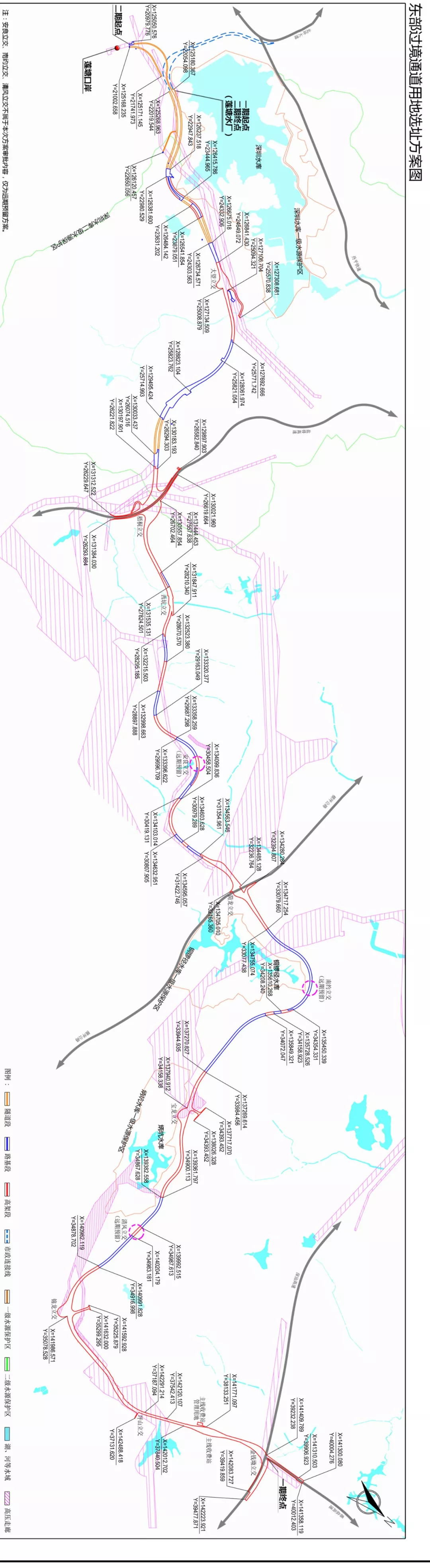深圳市擬建設深圳市東部過境通道,途經羅湖區(qū)蓮塘街道、黃貝街道和東湖街道,龍崗區(qū)橫崗街道、園山街道和寶龍街道,坪山區(qū)坪山街道,路線全長約32.2公里。