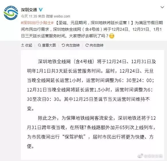 除此之外,為保障地鐵線網客流安全,深圳地鐵還將于12月31日跨年夜當晚在所轄7條線路額外加開65列次上線列車,為市民夜間出行“保駕護航”。