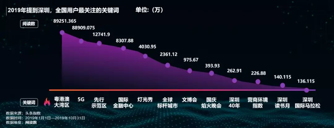 數(shù)據(jù)顯示,2019年提到深圳,全國網(wǎng)友最關(guān)注的三大關(guān)鍵詞是“粵港澳大灣區(qū)”、“5G”及“先行示范區(qū)”。