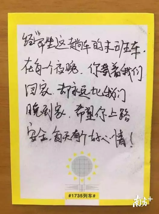 紙條上寫著:“經(jīng)常坐這趟車的末班車,在每個(gè)夜晚,你載著我們回家,卻永遠(yuǎn)比我們晚到家,希望你上路安全,每天有個(gè)好心情!”