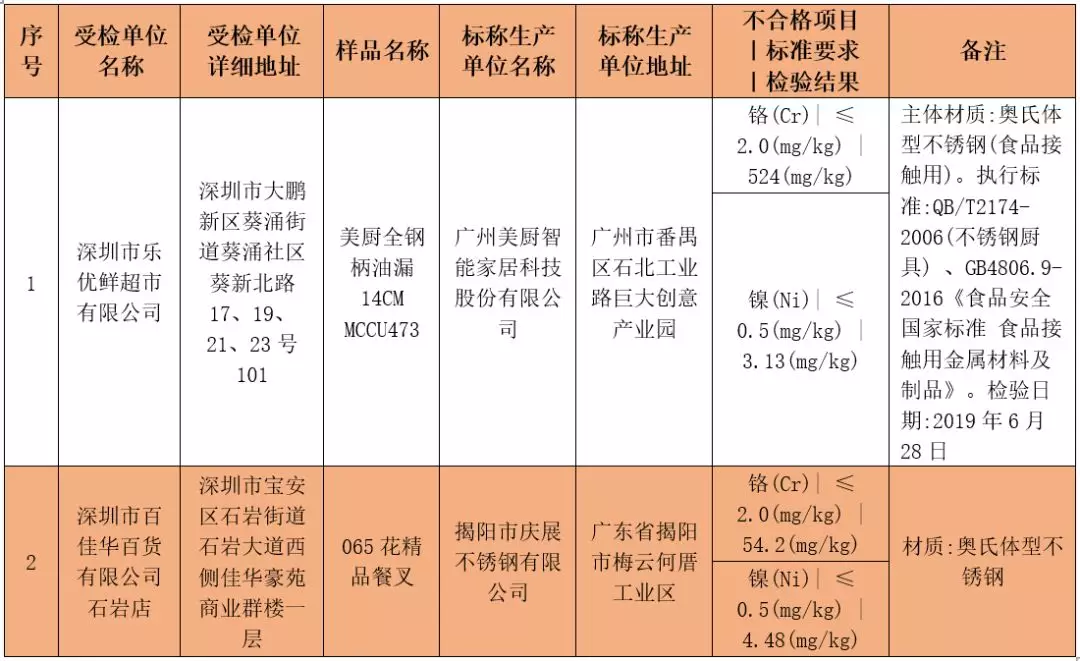 本次共抽檢生產(chǎn)及流通環(huán)節(jié)食品相關(guān)產(chǎn)品1174批次,涉及生產(chǎn)、流通環(huán)節(jié)經(jīng)營(yíng)主體256家,共檢測(cè)相關(guān)指標(biāo)6822項(xiàng)次。其中檢出不合格樣品2批次,涉及2家受檢單位,均來(lái)自流通領(lǐng)域企業(yè);涉及不合格產(chǎn)品類別均為食品接觸用金屬材料及制品;涉及不合格項(xiàng)目均為鎳(Ni)、鉻(Cr)。