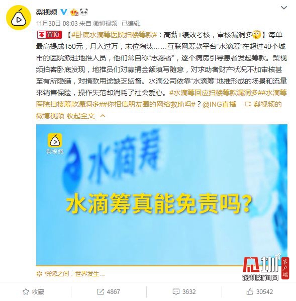 最早曝光水滴籌醫(yī)院掃樓籌款的梨視頻頁(yè)面截圖。