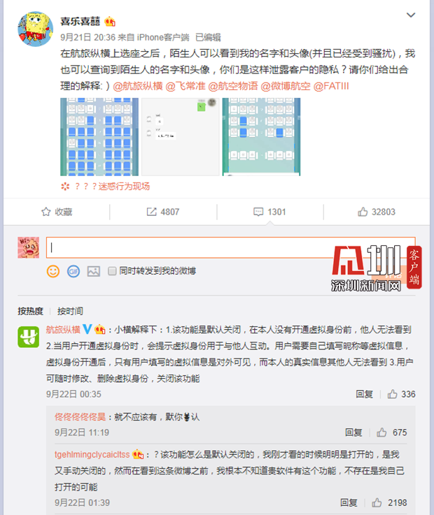 微博網(wǎng)友@喜樂(lè)喜囍最早爆出航旅縱橫App默認(rèn)開(kāi)啟陌生人社交功能,圖為頁(yè)面截圖。