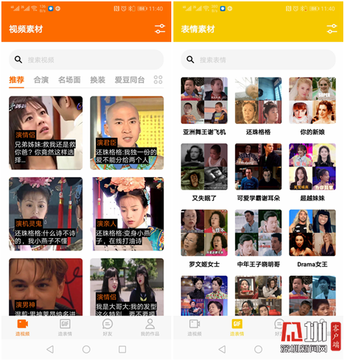 換臉軟件ZAO提供的視頻素材和表情素材頁(yè)面截圖。