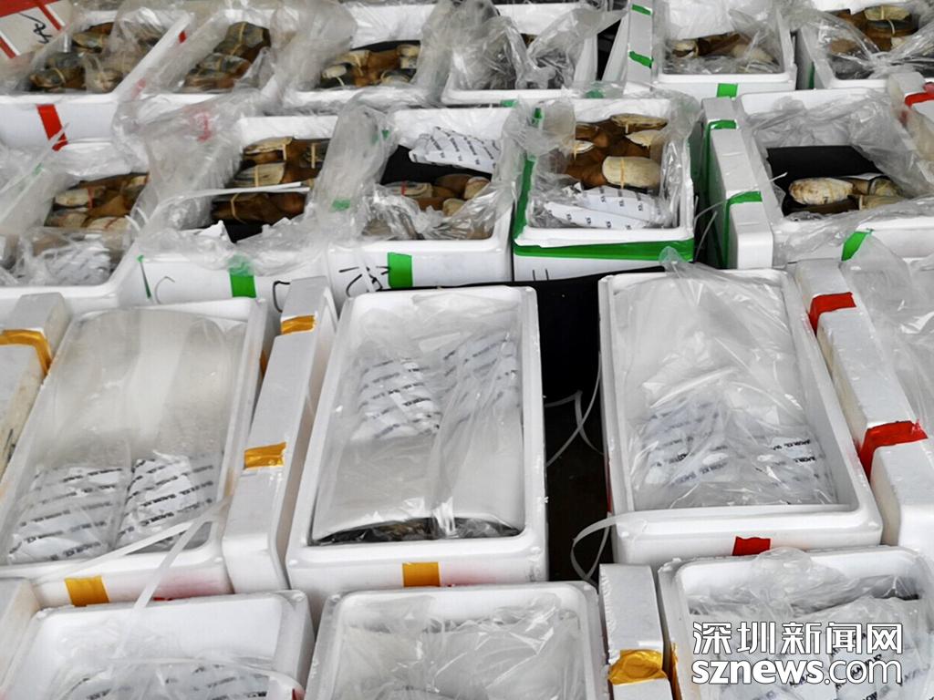 當(dāng)日上午,關(guān)員在一輛兩地牌貨車中發(fā)現(xiàn)大量未經(jīng)申報(bào)的象拔蚌,共計(jì)43箱。據(jù)該批象拔蚌外包裝標(biāo)記顯示,產(chǎn)地為美國。