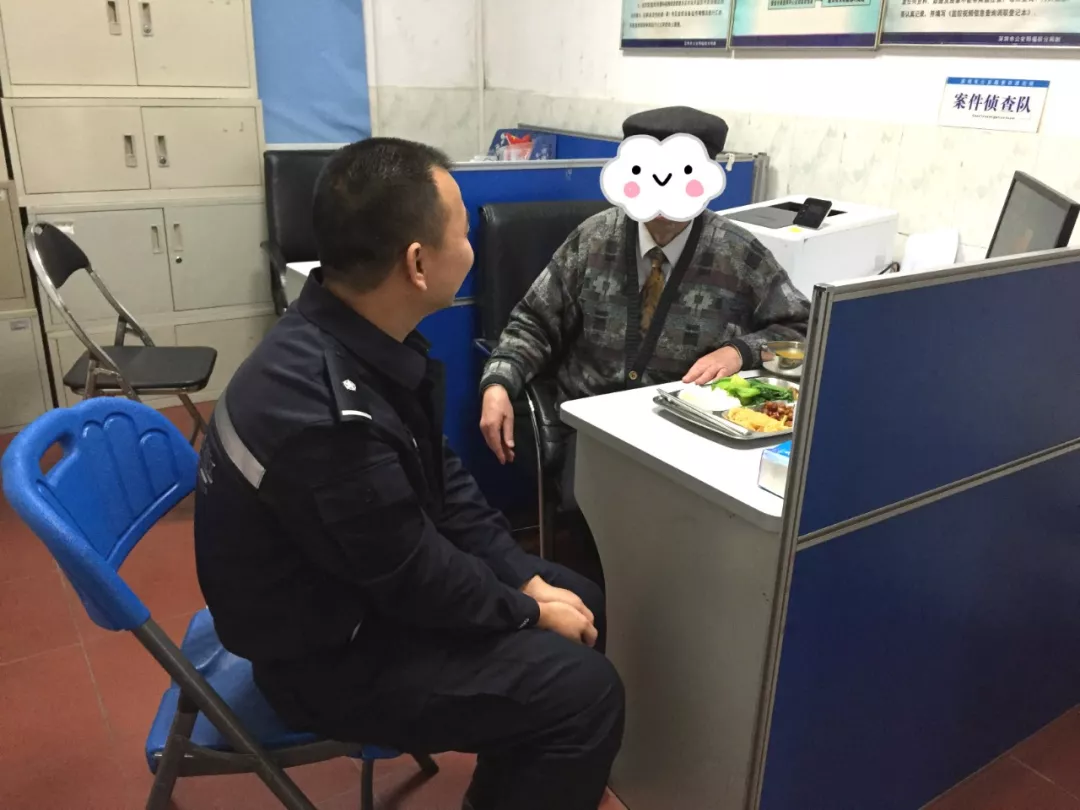 老人與派出所值班民警王研軍講述了自己前來(lái)的目的,看見(jiàn)老人一臉疲態(tài),王研軍立即安排地方給老人休息,并安排輔警吳海明供應(yīng)午餐給老人食用。