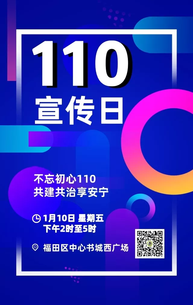 “110宣傳日”來啦!1月10日下午2時(shí)至5時(shí),福田區(qū)中心書城西廣場(chǎng)將作為“110宣傳日”主會(huì)場(chǎng),本次活動(dòng)主題是“不忘初心110,共建共治享安寧”。