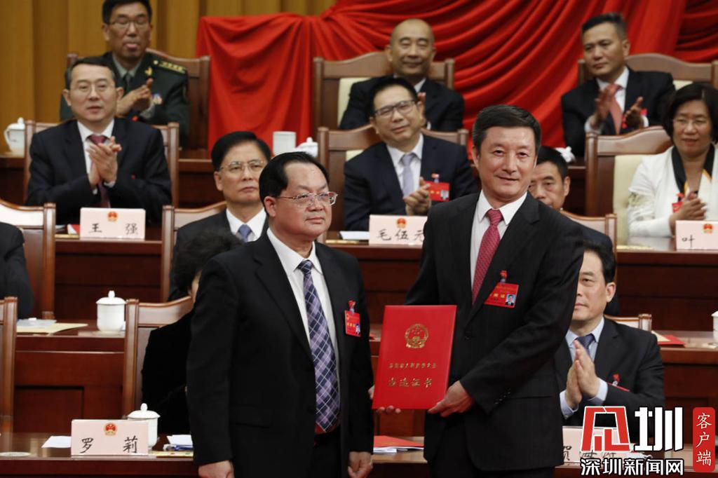 深圳市人大常委會主任駱文智(左)為新當(dāng)選的市人大常委會委員何銳軍(右)頒發(fā)當(dāng)選證書。