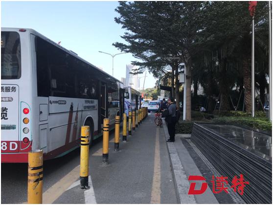 ▲1月14日下午,記者拍攝的深南大道南側(cè)崗廈北地鐵站②公交站,被隔離樁隔離處的人行道非常狹窄,給行人、自行車和上下公交車的乘客都帶來不便。