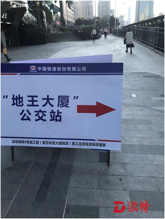 而另一處地點(diǎn),從大劇院地鐵站 F出口處往羅湖書城方向,行人須繞行街邊花園步道和街邊商家通道,對(duì)于騎自行車和電動(dòng)車的人尤其不便。而地王大廈公交站臺(tái)跟崗廈北地鐵站②公交站臺(tái)一樣非常狹窄,站臺(tái)左右兩邊的人行道狹窄處僅約兩米寬。在該處站臺(tái)背后,中國鐵建股份有限公司設(shè)置了一塊站名指示牌,署名單位為地鐵5號(hào)線施工總承包項(xiàng)目經(jīng)理部。記者詢問了一位路過的市民,市民說經(jīng)常路過此地,應(yīng)該是地鐵施工所以就占用了之前的人行道,"這里走路還好,騎車就不方便了,因?yàn)橛信_(tái)階"。