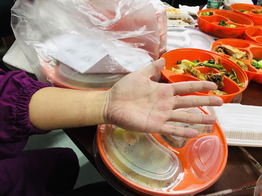 ▲大年三十下午2時(shí)左右,深圳市第三人民醫(yī)院感染 ICU病房的護(hù)士剛吃上飯。他穿著防護(hù)服、戴著口罩,悶得透不過(guò)氣來(lái),渾身都是汗。手被泡得起了皺,臉上依然還有口罩壓著的痕跡。
