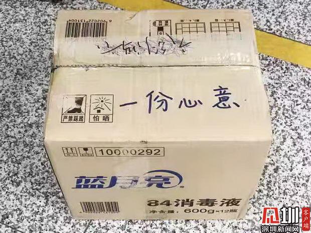 2020年1月30日晚20:55分,深圳地鐵梅村站工作人員正在安檢口執(zhí)勤時,一名戴著口罩的男子走進來,放下一個箱子便轉身離去。工作人員發(fā)現(xiàn)箱子上寫著“一份心意”四個字,打開發(fā)現(xiàn)箱內(nèi)有12瓶84消毒液,正欲上前感謝時,男子已匆匆離開,只留下了一個背影。