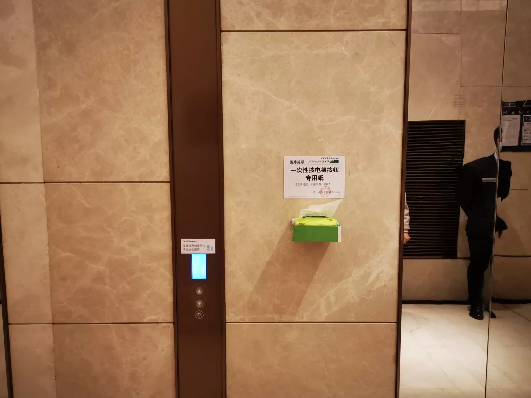 考慮到防控形勢需要,中心對(duì)電梯間及按鈕每天至少不低于2次消毒、且每天更換保鮮貼膜外,又于31日在各個(gè)電梯廳增設(shè)了一次性抽紙,供乘坐電梯按電梯按鈕時(shí)取用。(注:部分樓棟、明天陸續(xù)增設(shè)到位)