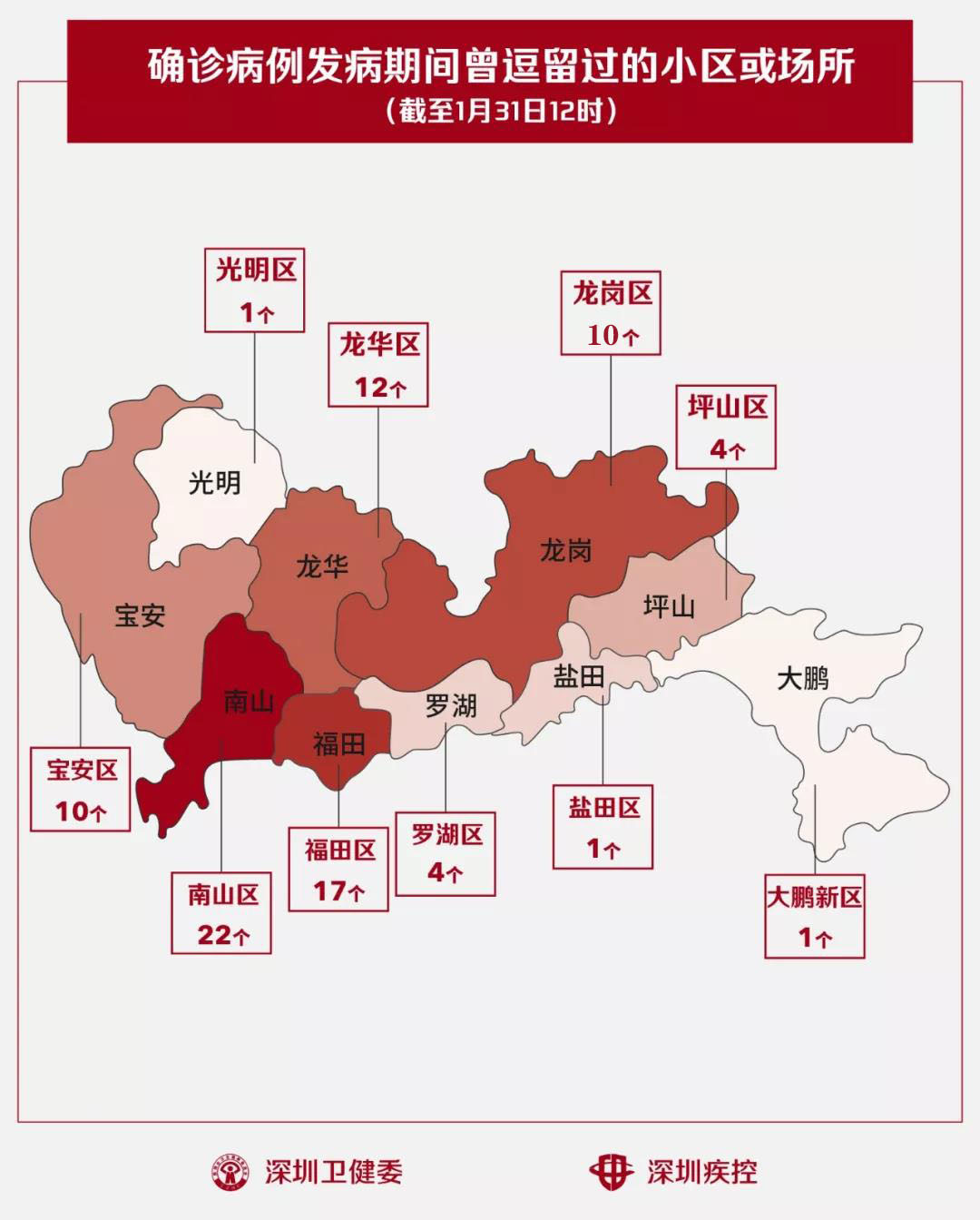 截至1月31日12時,深圳累計確診的134個“新型肺炎”患者,曾在出現(xiàn)病征期間逗留過以下82個場所,其中有部分地方同時出現(xiàn)了多個病人(主要是一個家庭內(nèi)有多人發(fā)?。?/span>