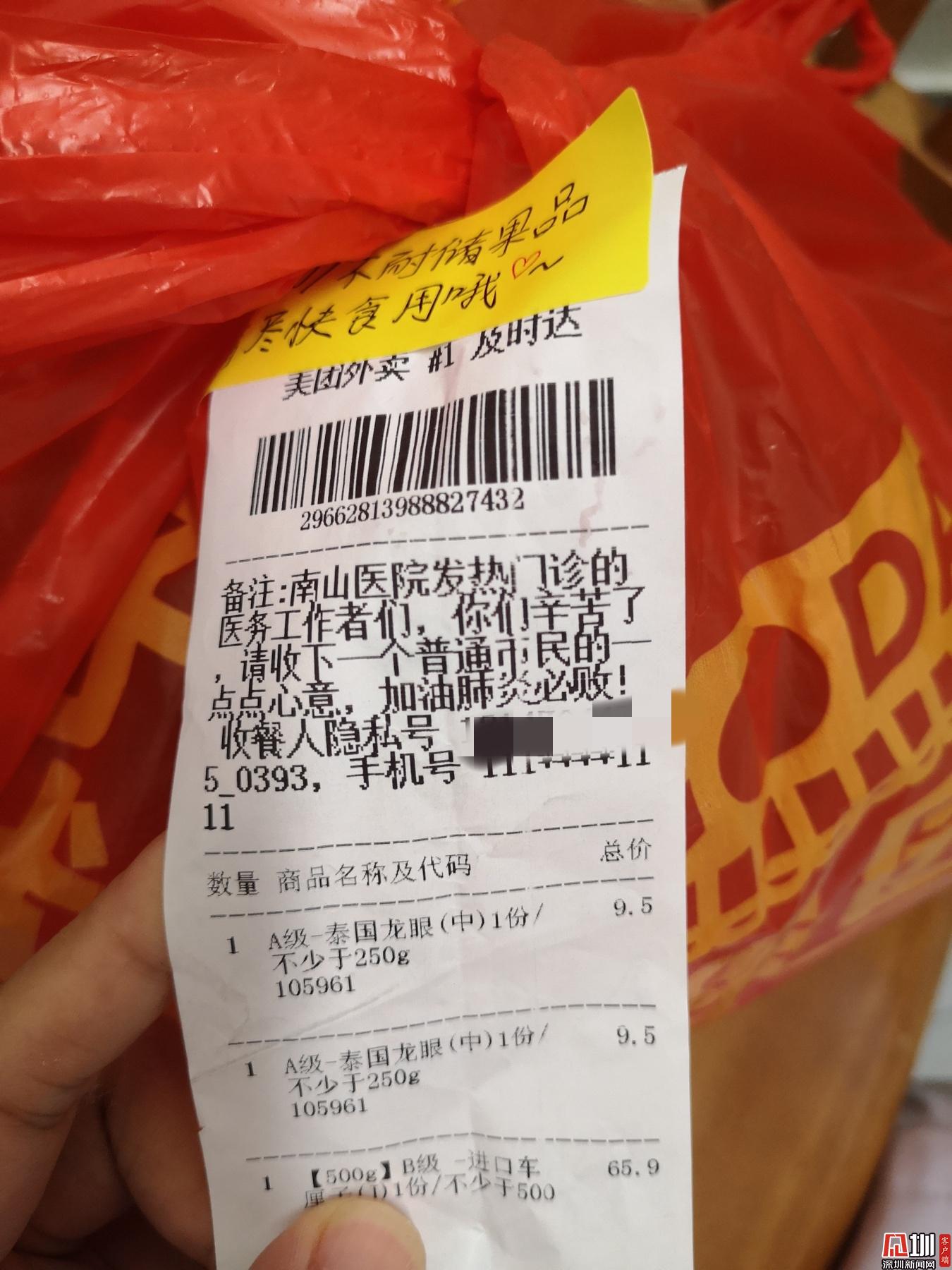 見圳客戶端·深圳新聞網(wǎng)2020年2月1日訊 (見圳客戶端、深圳新聞網(wǎng)記者 劉夢婷 通訊員 深協(xié)和)“老淚縱橫!”1月30日晚上8點56分,華中科技大學(xué)協(xié)和深圳醫(yī)院(南山醫(yī)院)手外科護士王敏在朋友圈曬了一張照片,瞬時網(wǎng)友們紛紛點贊。照片里是一個紅色塑料袋上貼著一張外賣單,備注上寫著,“南山醫(yī)院發(fā)熱門診的醫(yī)務(wù)工作者們,你們辛苦了!請收下一個普通市民的一點點心意,加油,肺炎必??!”