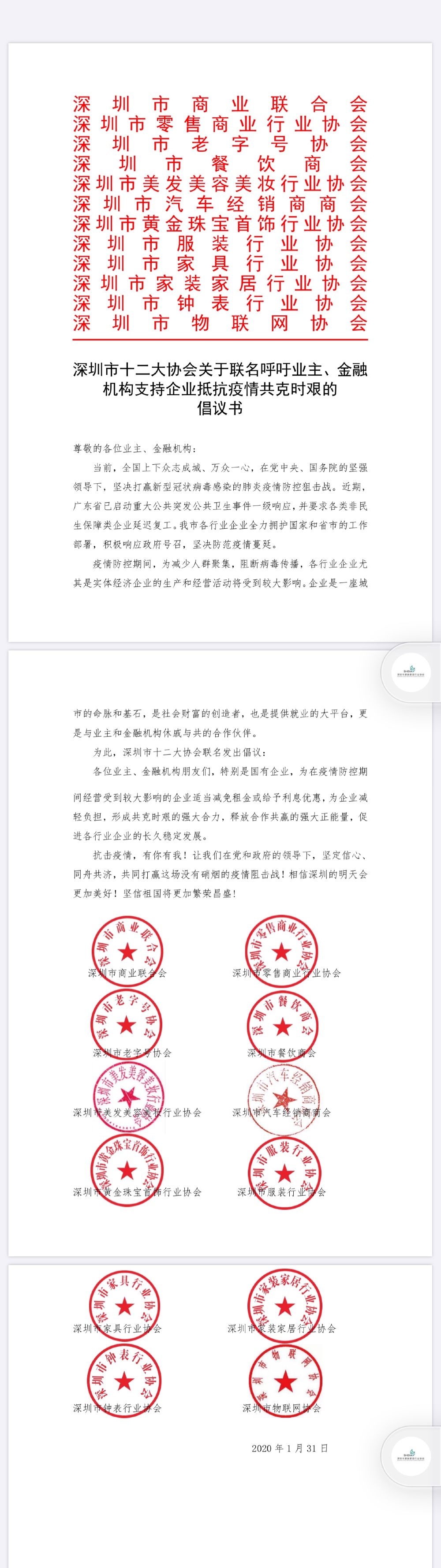 見(jiàn)圳客戶(hù)端·深圳新聞網(wǎng)2020年2月1日訊(見(jiàn)圳客戶(hù)端、深圳新聞網(wǎng)記者 金洪竹)1月31日深夜,一份特別的倡議書(shū)在網(wǎng)絡(luò)熱傳。深圳市商業(yè)聯(lián)合會(huì)、深圳市零售商業(yè)行業(yè)協(xié)會(huì)、深圳老字號(hào)協(xié)會(huì)、深圳市餐飲商會(huì)、深圳市美發(fā)美容美妝行業(yè)協(xié)會(huì)、深圳市汽車(chē)經(jīng)銷(xiāo)商協(xié)會(huì)、深圳市黃金珠寶首飾行業(yè)協(xié)會(huì)、深圳市服裝行業(yè)協(xié)會(huì)、深圳市家具行業(yè)協(xié)會(huì)、深圳市家裝家居行業(yè)協(xié)會(huì)、深圳市鐘表行業(yè)協(xié)會(huì)和深圳市物聯(lián)網(wǎng)協(xié)會(huì)等12家商協(xié)會(huì)發(fā)出聯(lián)名倡議,呼吁業(yè)主、金融機(jī)構(gòu)支持企業(yè)抵抗疫情、共克時(shí)艱。