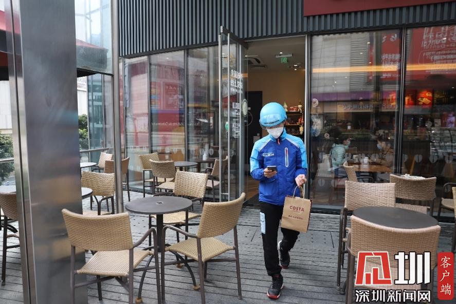 在咖啡店等待商家制作完成,取貨后,王彭輝便馬不停蹄地騎著電動(dòng)車前往訂單上的地址。平日繁華的南山商區(qū),現(xiàn)在空空蕩蕩的,除了偶爾有車輛開過,路上幾乎都是外賣小哥、快遞小哥的身影,“現(xiàn)在就是大家都待在家里,路上人和車少了,我們也能更快地把訂單送達(dá)?!蓖跖磔x說:“我以前是在梅林那邊工作,剛開始來南山這邊送外賣的時(shí)候,對這里的路不熟悉,覺得每個(gè)路口都長得一樣,抬頭都是大廈,低頭都是人,但是做得久了以后,慢慢的就熟悉了。”