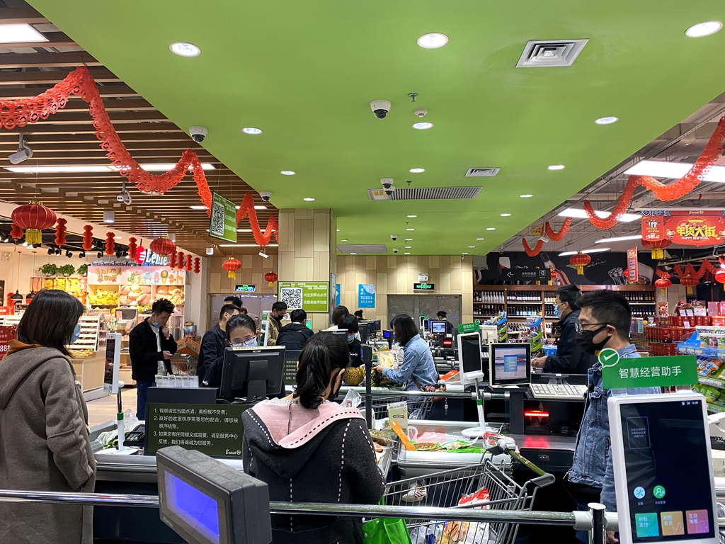 與寂寥的街道相映成趣的是商場內(nèi)排隊購買果蔬的市民