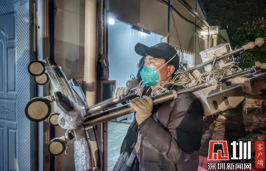 2月2日,工作人員將邁瑞設(shè)備扛進(jìn)火神山醫(yī)院儲(chǔ)藏室。(邁瑞醫(yī)療供圖)