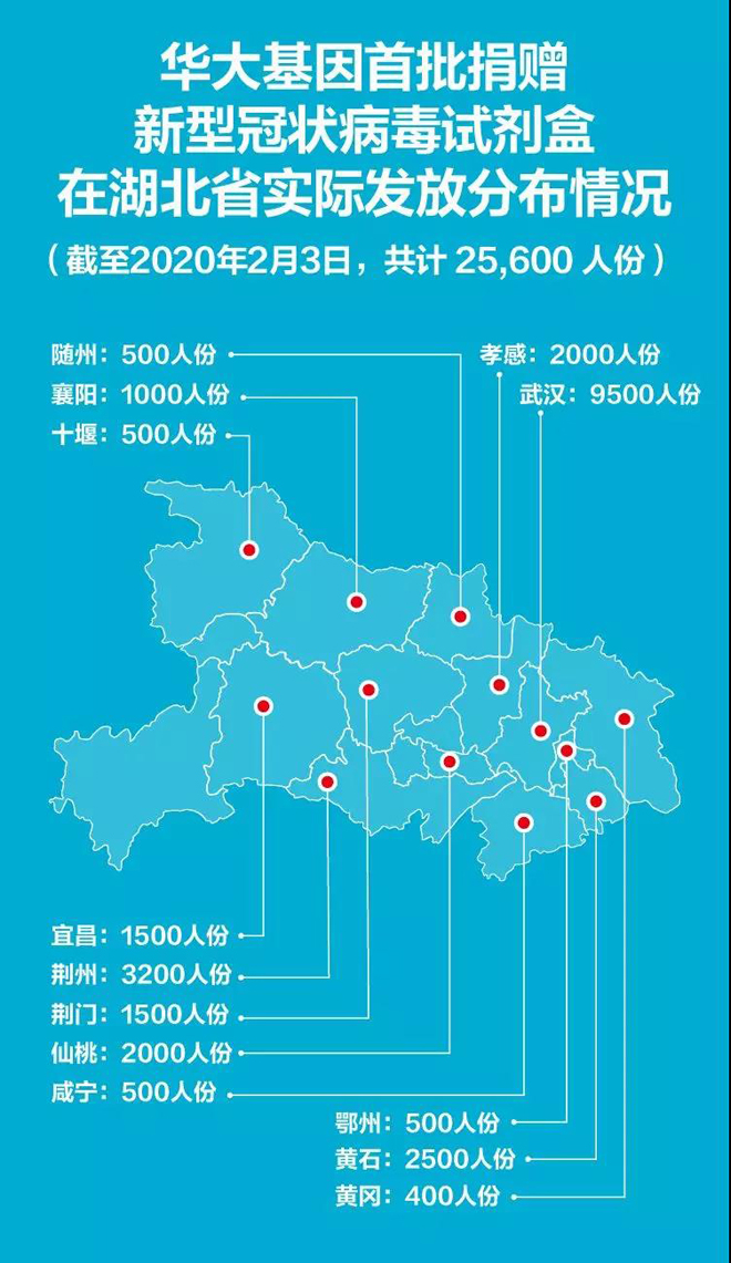 2月5日,記者獲悉,華大基因首批承諾向湖北地區(qū)捐贈的2萬人份新型冠狀病毒試劑盒(每盒50人份),實際已發(fā)貨到位2.56萬人份。其中,武漢市發(fā)放9500人份,湖北(非武漢地區(qū))發(fā)放1.61萬人份。目前,針對湖北地區(qū)的試劑盒捐贈仍在進行中。
